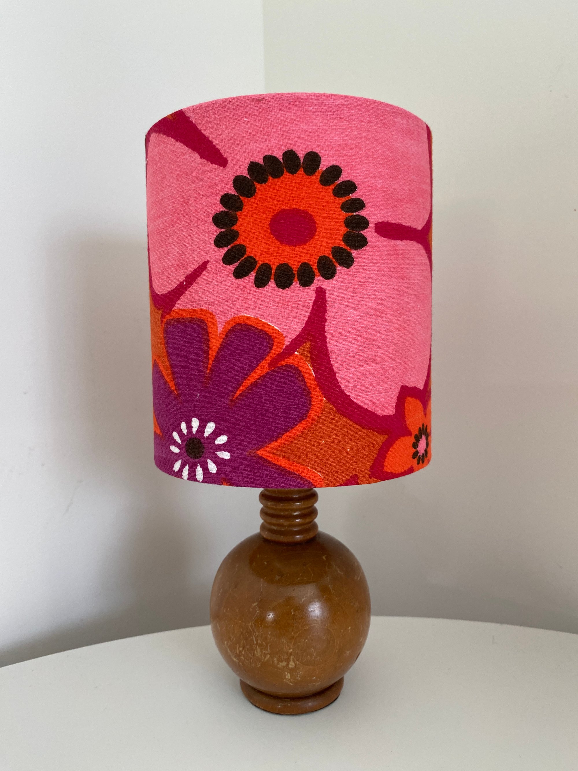 Base is pre loved with some wear and shade is pre loved but recovered in original retro cotton fabric
